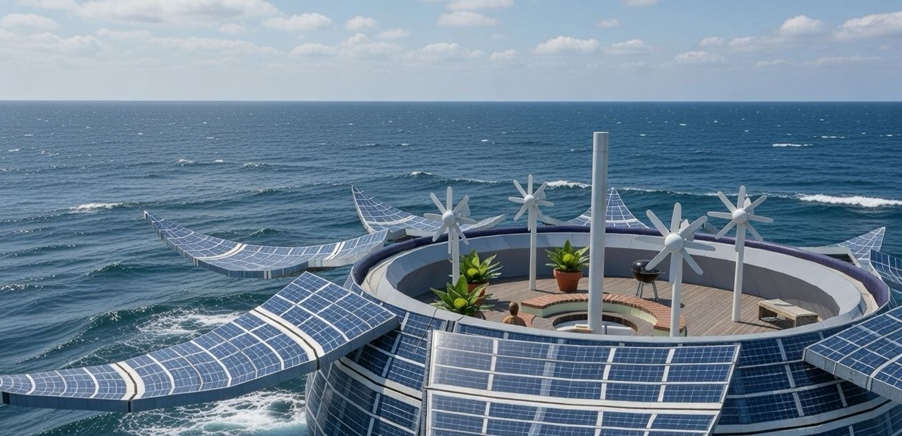 Conventional ships have several limitations like the uncomfortable pitch and roll caused by waves, the risk of structural damage in heavy storms and other dangerous situations that may occur on open seas. The present invention solves all these kinds of shortcomings / inconveniences, allowing us to live a safer and self-sustainable life (learn more) on the current water covered uninhabited area, up to 70% of Earth’s surface.